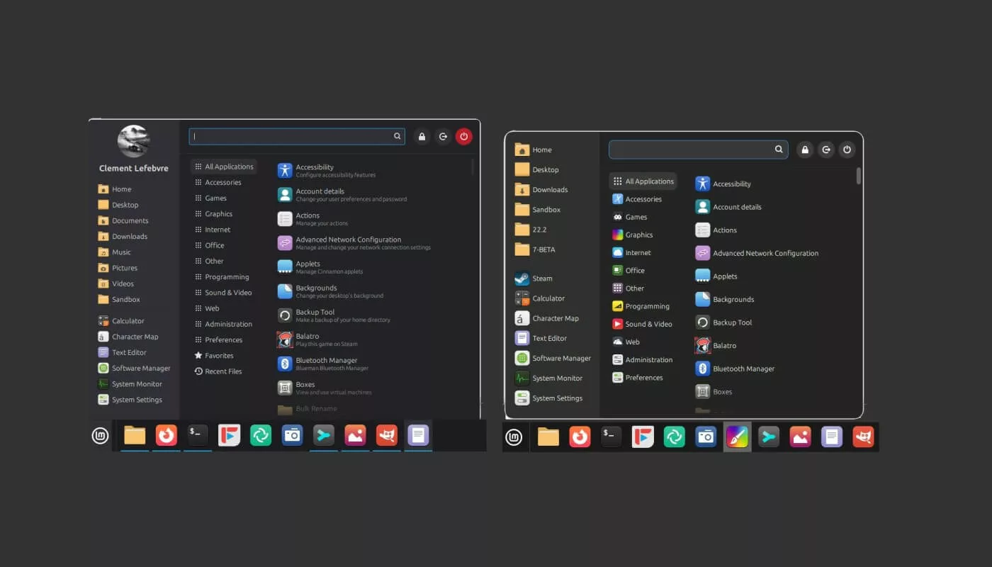Нова версія Cinnamon також отримає оновлене меню додатків з новим дизайном, що включає бокову панель з секціями для аватару користувача, місць та улюблених додатків. Наразі нове меню Cinnamon виглядає трохи інакше, з системними кнопками, переміщеними на верхню частину праворуч від рядка пошуку.